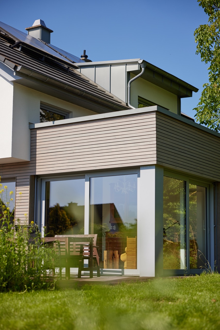 In diesem Projekt wurde ein stilvoller Anbau aus Tiroler Hochgebirgslärche umgesetzt, der durch eine schützende Lasur zusätzlich veredelt wurde. Die Lärchenholzverkleidung zeichnet sich durch ihre unsichtbare Befestigung aus, die der Fassade eine nahtlose und moderne Ästhetik verleiht und die natürliche Maserung des Holzes perfekt in Szene setzt.