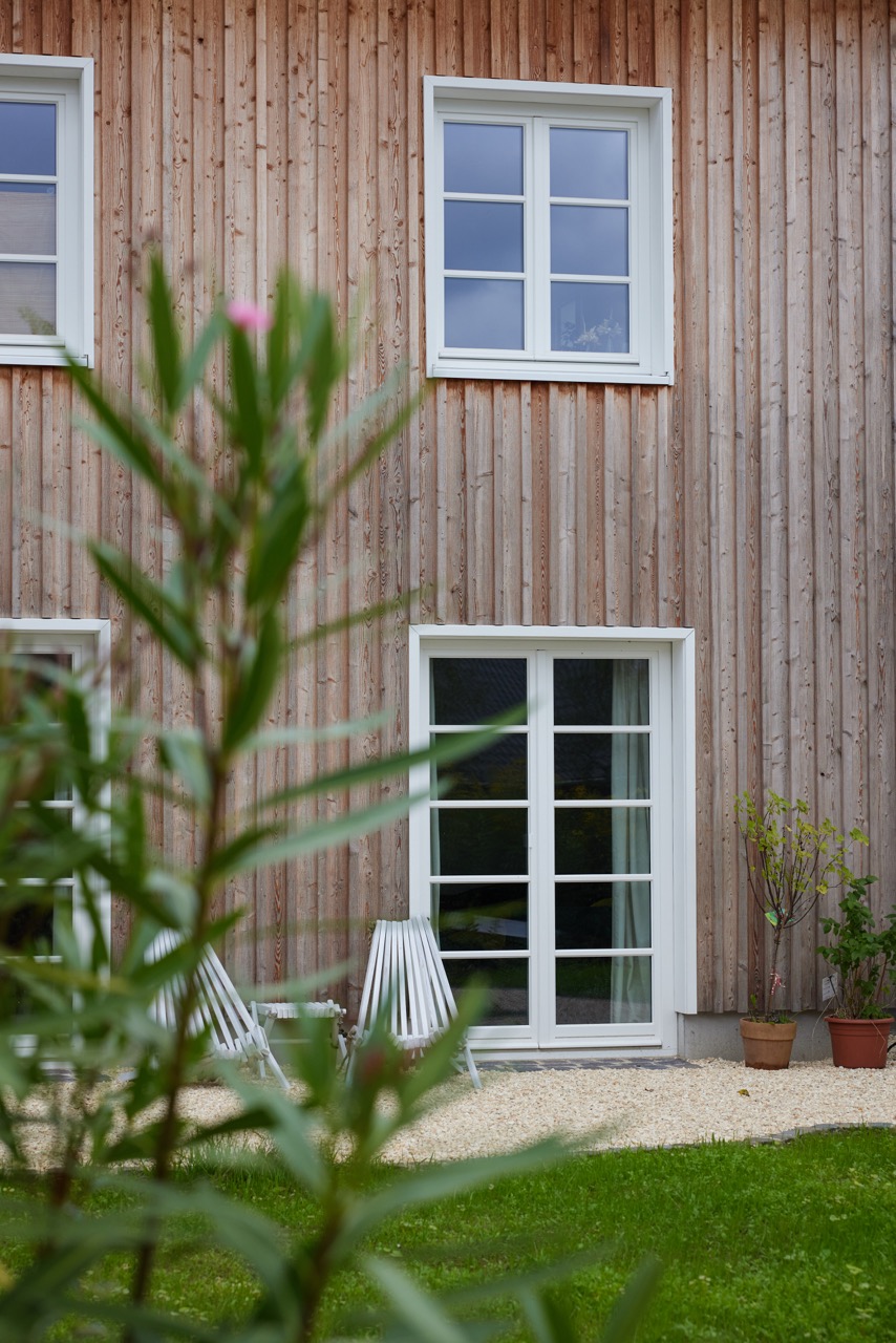 Für dieses Projekt wurde eine nachhaltige Holzfassade umgesetzt, die durch eine ökologische Holzfaserdämmung und eine natürliche Boden-Deckel-Schalung in Lärche überzeugt. Die Kombination dieser umweltfreundlichen Materialien ermöglicht eine hervorragende Energieeffizienz und sorgt gleichzeitig für eine langlebige Fassade, die sich durch Stabilität und Widerstandsfähigkeit gegen Witterungseinflüsse auszeichnet. Die Boden-Deckel-Schalung, bei der sich die Bretter überlappen, schützt das Gebäude zuverlässig und unterstützt die natürliche Klimaregulierung.